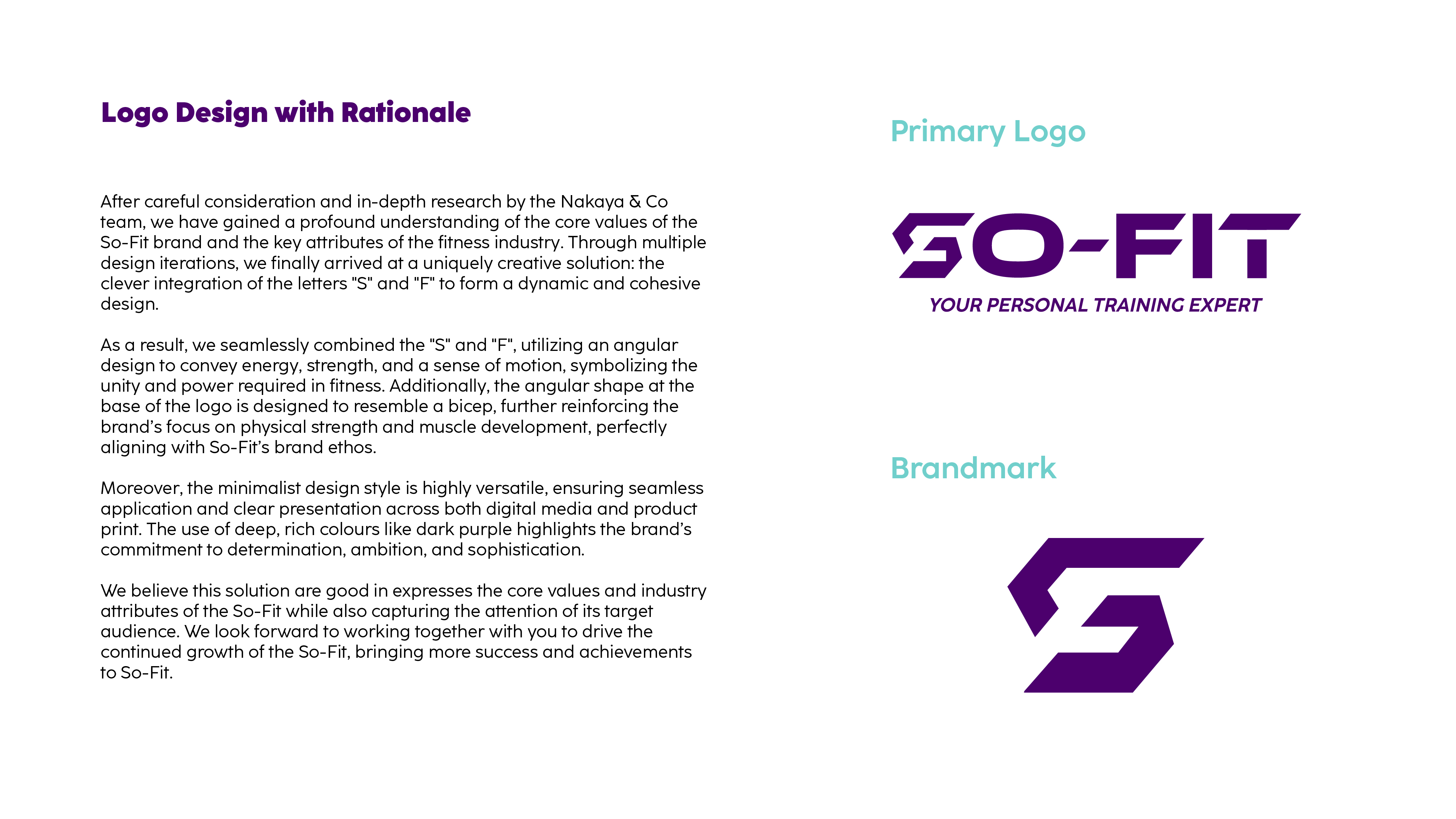 Nakaya & Co. is honoured to have been invited to create a new brand visual identity for So-Fit. After extensive research and multiple discussions, we developed a deep understanding of So-Fit’s core values and the key attributes of the fitness industry. Through several design iterations, we ultimately arrived at a uniquely creative solution—seamlessly integrating the letters ‘S’ and ‘F’ into a dynamic and powerful logo design.