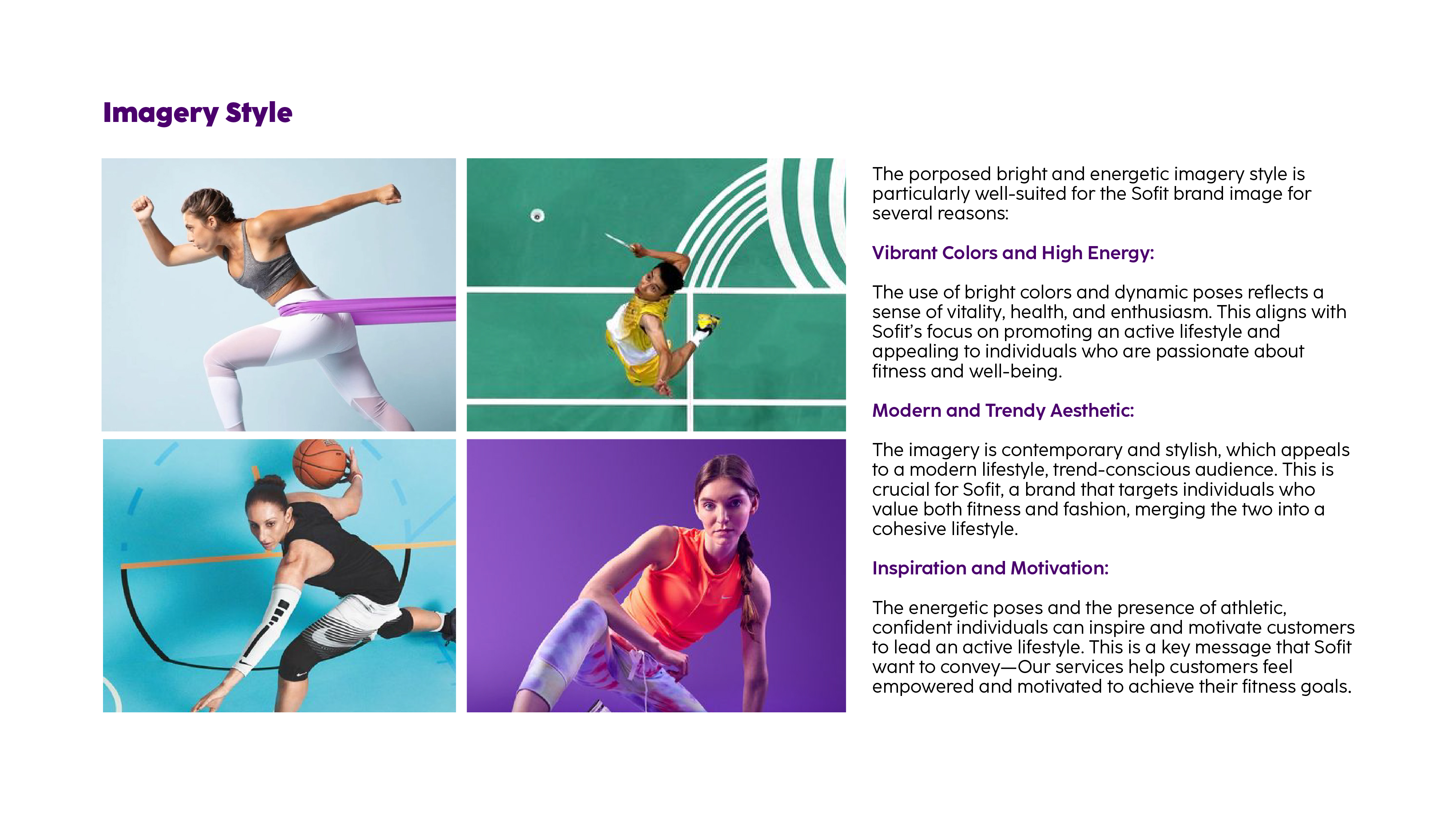 For So-Fit’s brand imagery, we propose a bold and dynamic visual style, based on the following key considerations: