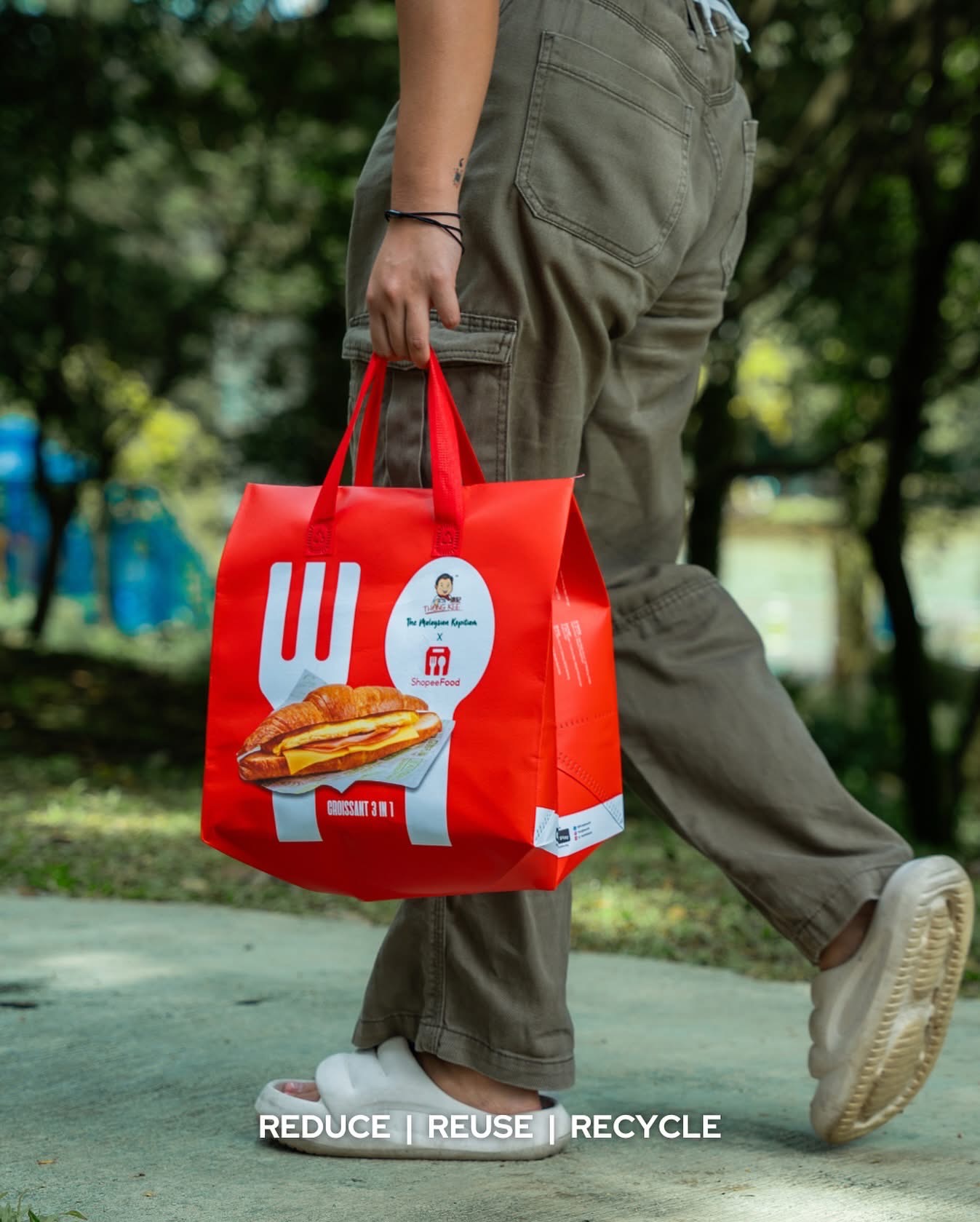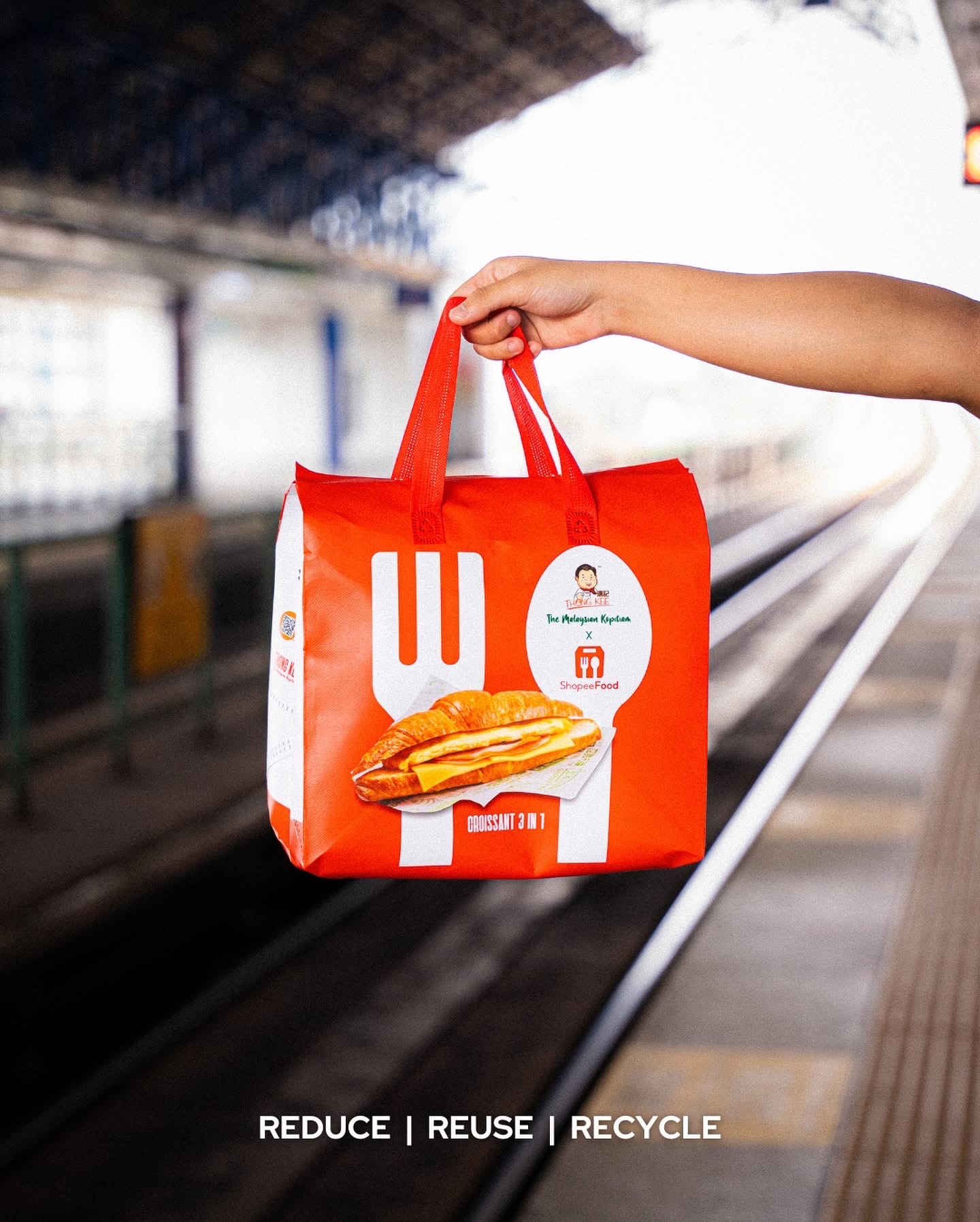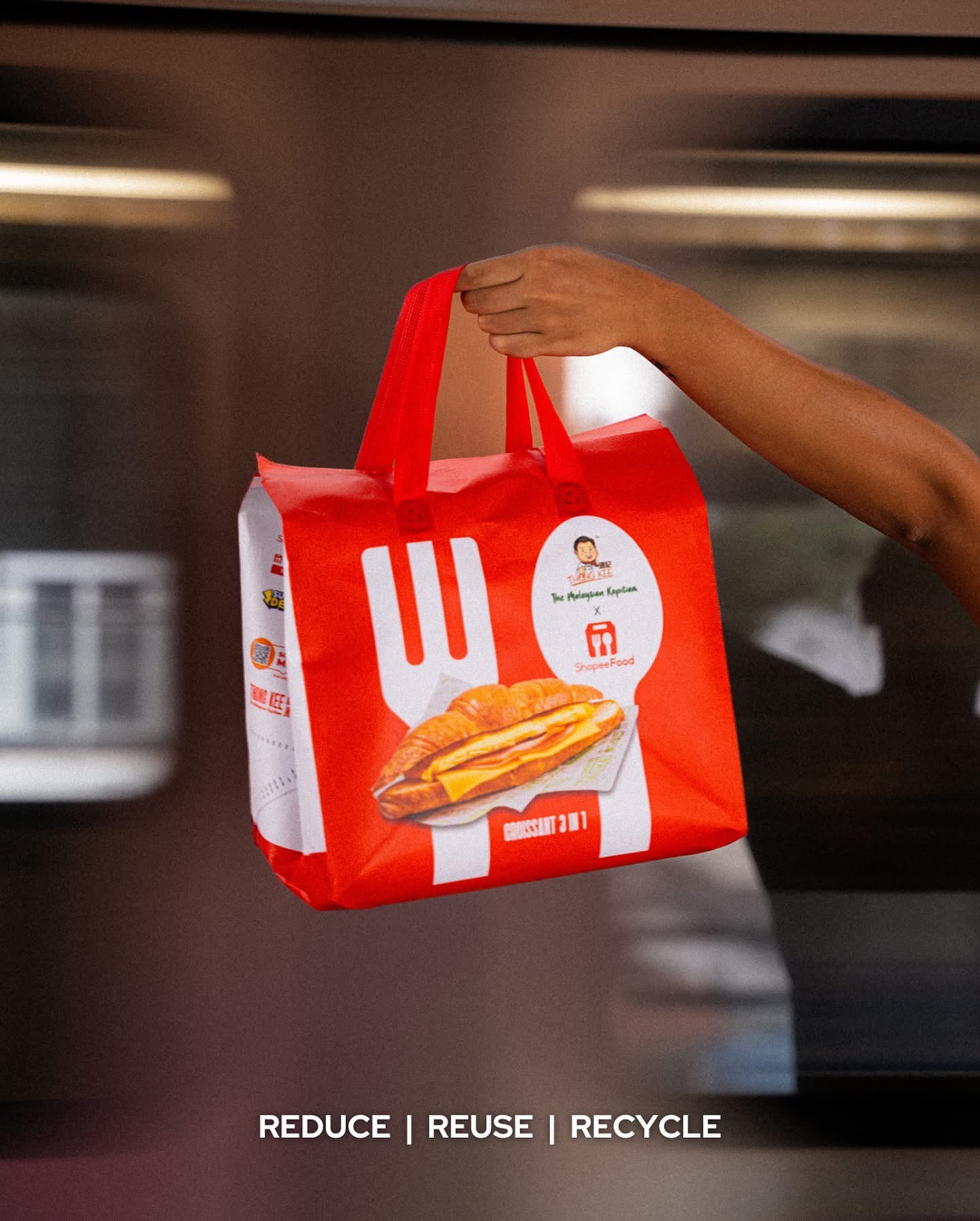 Thong Kee’s Iconic Products – To amplify Thong Kee’s presence, we boldly featured its two most iconic offerings—3-in-1 Croissant and 1+1 Coffee—directly on the bag. This striking visual represents "We bring Thong Kee to you with ShopeeFood."